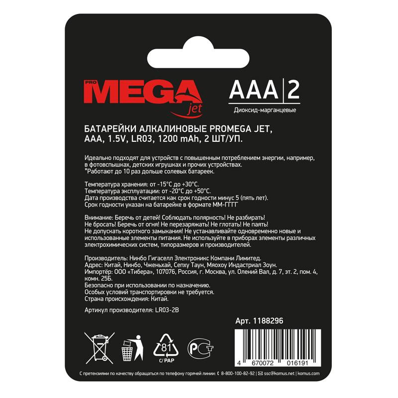 Батарейка ААА мизинчиковая ProMega jet (2 штуки в упаковке) Товар относится к ценовому сегменту "бюджет". Имеет базовые характеристики и более простую упаковку. Отвечает основным требованиям потребления. Внешний вид и/или характеристики товара могут быть изменены производителем в соответствии с производственным процессом.
